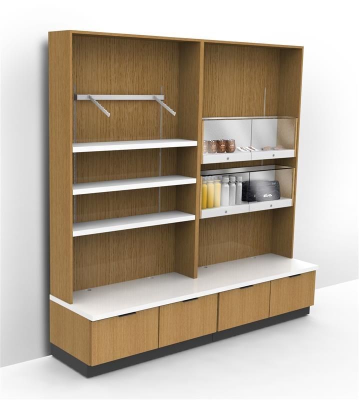 The Accessory Wall (FX-8) can stand alone, be used in an alcove, or installed next to a Hospitality Wall. The Accessory Wall includes adjustable shelving and a waterfall bracket for hanging clothing with lockable storage in the cabinet below.
